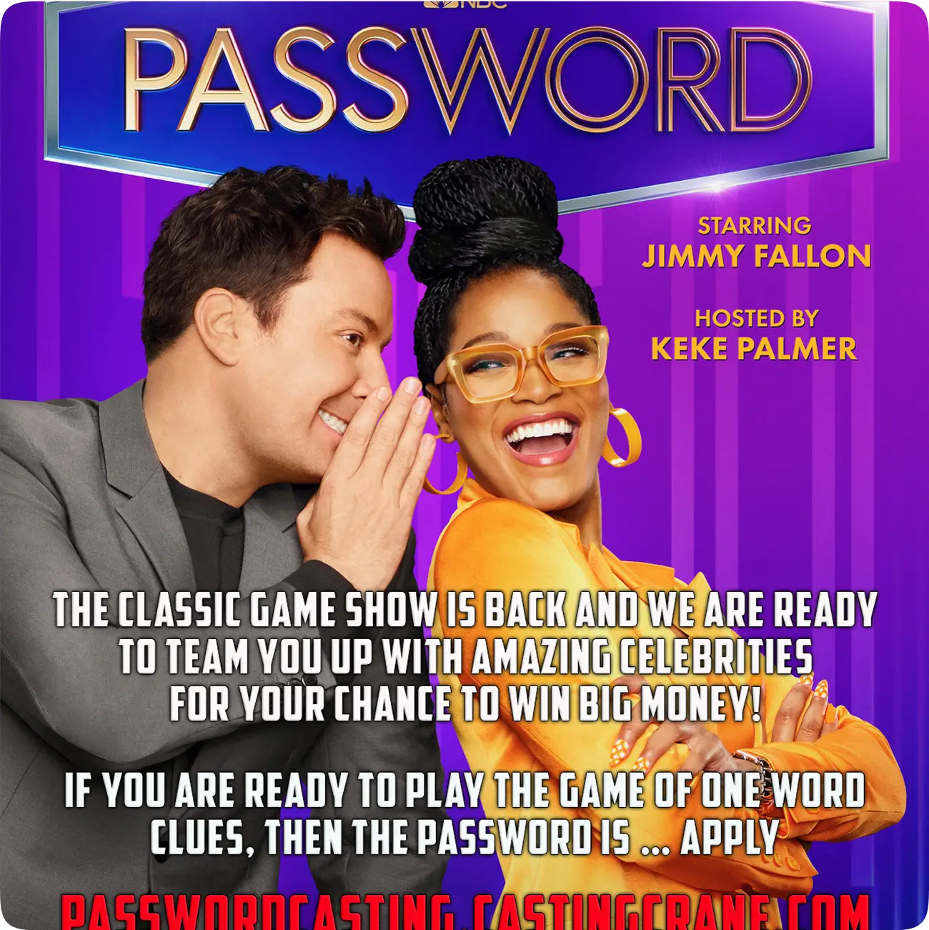 NBC’s PASSWORD is back and casting for Season 3! If you’re ready to team up with amazing celebrities for your chance to win big money, APPLY TODAY!